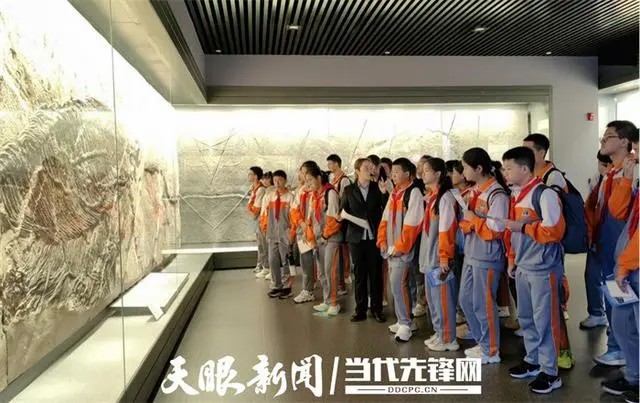 研学如同行走的课堂。在地质博物馆的“神秘贵州”展厅,同学们穿越了震旦纪、寒武纪、奥陶纪、侏罗纪和白垩纪等时代,454件古生物化石标本、生动的场景复原和多媒体影片,让同学们仿佛置身于“古生物王国”,聆听生命的故事。八年级(1)班学生曾炬峰告诉记者,他深刻感受到了贵州古生物化石资源的丰富,也感叹于贵州千沟万壑、千呼万动的绝美景观。