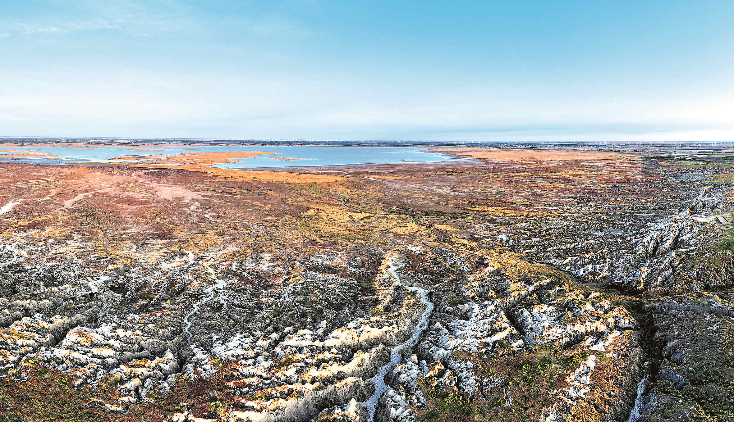 乾安泥林总面积110平方公里,主要保护对象为“泥林”潜蚀地质地貌景观、晚更新世古生物化石产地、湿地生态系统和国家重点保护鸟类。泥林潜蚀地貌景观主要分布在大布苏湖东岸,南北长约7.5公里,东西宽约1公里,有重力作用地貌、地貌微缩景观、流水地貌等。从高空俯瞰,泥林形如巨树之根,从湖里向湖岸延伸,彰显着自然伟力,气魄雄浑。从近处看,泥丘如丛林、沟壑似刀劈,人行其间,一种上古洪荒之感油然而生,极尽苍凉之态,别具趣味。