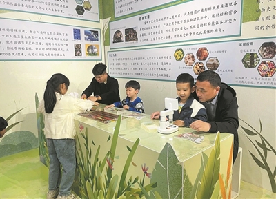 瓯海区博物馆希望以此次展览为契机,加强馆际交流与合作,助力儿童友好城市创建,引导青少年形成热爱自然、珍惜自然、保护自然的生态观。展厅主色调使用森林的颜色作为基底,模拟昆虫生活环境,以化石勾勒出昆虫起源和昆虫进化的大致蓝本;展览设置了许多互动类型的游戏,大大增加了展览的趣味性,如“显微镜观察昆虫标本”“昆虫桌游”“昆虫折纸”等。此外展厅还设置了科普区域,打造沉浸式学习氛围,带领观众近距离识别、观察昆虫化石,了解它们的结构和生活习性。