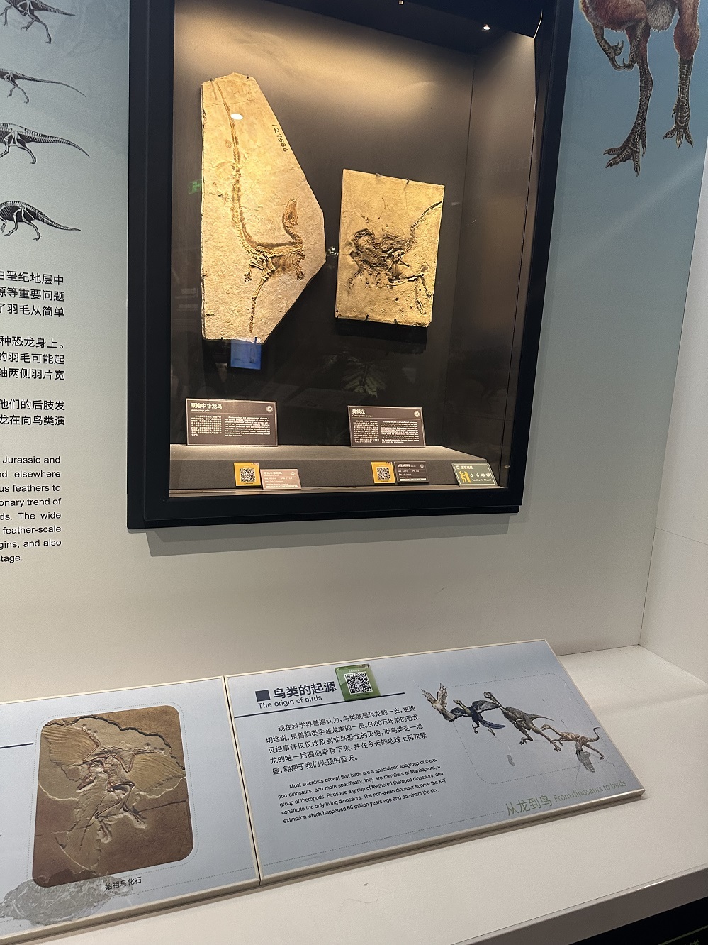 在一楼,记者看到更多动植物类“镇馆之宝”,最吸睛的当属“中华龙鸟”。“中华龙鸟俗称‘长有羽毛的恐龙’,其毛发与鸟类羽毛具有同源关系,是研究恐龙到鸟类演化过程中非常重要的环节。这个化石标本来自我国辽西热河生物群,于1996年被发现并报道,当即轰动世界。”据傅强介绍,6600万年前的恐龙灭绝仅涉及非鸟恐龙,鸟类这一恐龙后裔幸存下来,翱翔于今天的蓝天之上。中华龙鸟的羽毛精美,形态动感,既具有科学价值,也有艺术价值,博物馆的文创产品和logo设计都会用到它。