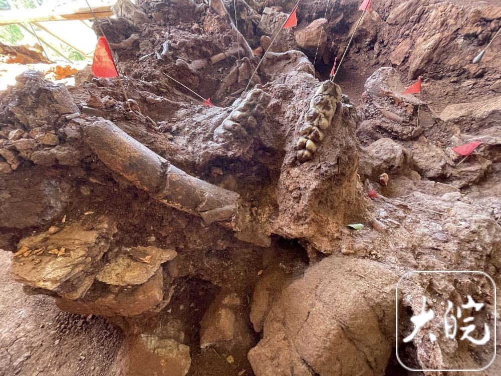 在另一处裂隙,大皖新闻记者看到了一具较为完整的象类化石。“这是之前发现的比较完整的象类化石,经过鉴定为中华乳齿象,大象的两排臼齿和门齿(象牙)清晰可见。在中华乳齿象化石边上,还有一具剑齿虎的化石,剑齿虎的肋骨和头骨能够比较明显看到。”工作人员向大皖新闻记者介绍说。