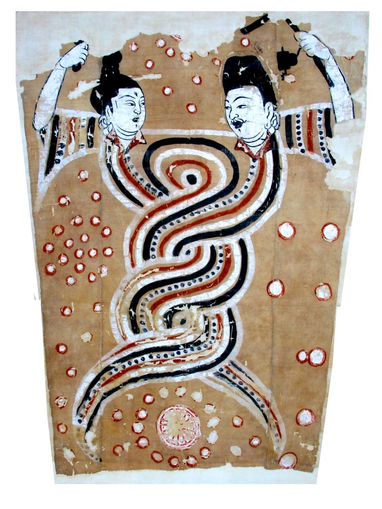↑ 伏羲女娲像绢画(吐鲁番博物馆供图)