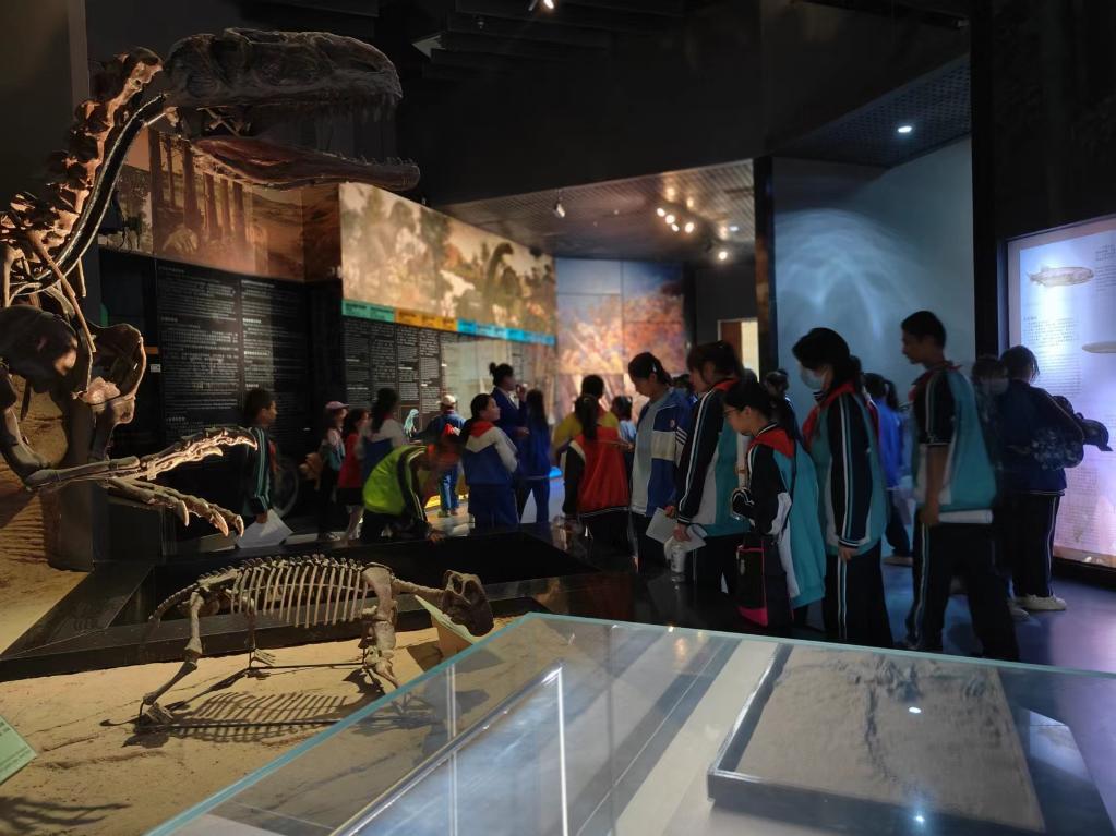 ↑ 游客在参观吐鲁番美丽巨犀化石。新华社记者 张瑜 摄