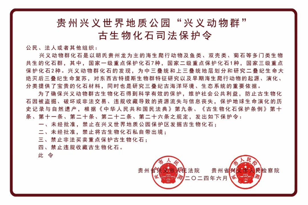 为深入贯彻习近平生态文明思想,践行“绿水青山就是金山银山”理念,为严厉打击盗掘、破坏、非法买卖、违规收藏兴义动物群古生物化石违法行为,保护地球生命演化的历史记录与自然遗产。6月5日,兴义市人民法院以“6·5”世界环境日为契机,联合兴义市人民检察院向社会公众发出了《贵州兴义世界地质公园“兴义动物群”古生物化石司法保护令》。黔西南州中级法院相关负责人到场进行指导。