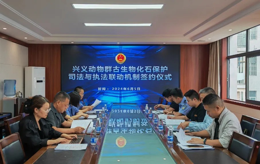 当天, 兴义市人民法院还联合兴义市人民检察院、兴义市公安局、兴义市自然资源局、兴义市市场监督管理局、兴义市林业局及贵州兴义国家地质公园管理处共同签署了《兴义动物群古生物化石保护司法与执法联动机制的意见》, 联动机制坚持“依法依规,有机衔接”、“整合资源,协同联动”、“高效畅通,提升效能”的工作原则,确立了联席会议、信息资源共享、双向咨询、联动执法等六项机制。充分发挥各部门职能优势,加强行政执法与刑事司法衔接,构建“司法审判+检察监督+行政执法”的“保护”机制,共同为保护古生物化石、保护地区生物多样性提供行政司法保障,共建兴义动物群古生物化石保护“大格局”,为建设“康养胜地、人文兴义”夯实基础。