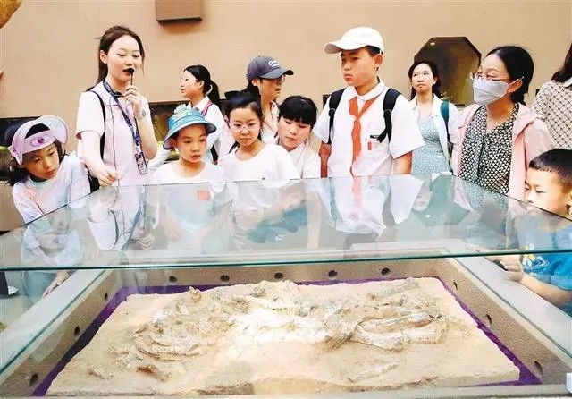 ↑ 讲解员为前来参观的小学生讲述化石的故事。