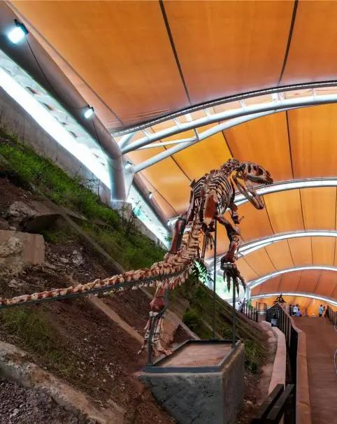遗址馆设计展陈面积近6000m²,由序厅、6个展陈区和尾厅组成,集中保护展示了原址发掘形成的世界上最大的侏罗纪单体恐龙化石墙,近5000块化石在墙面星罗密布包含蜥脚类、兽脚类和剑龙类等,蔚为壮观。