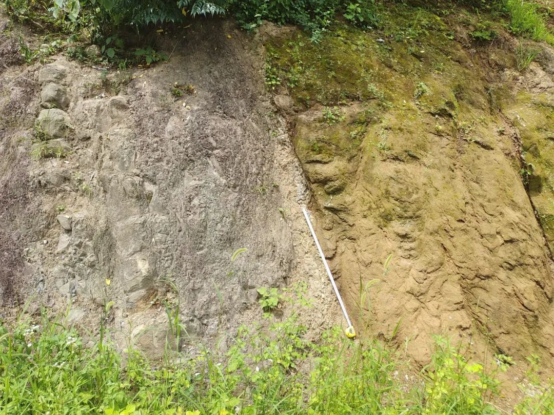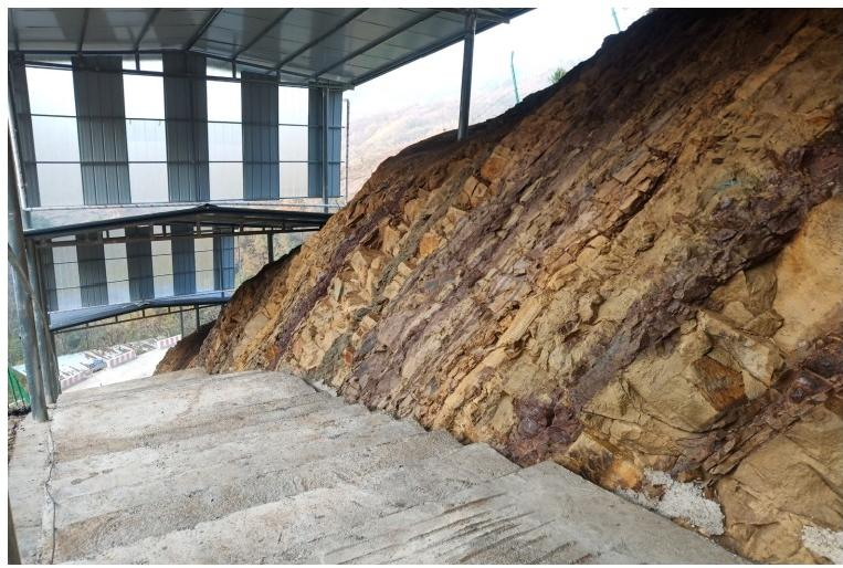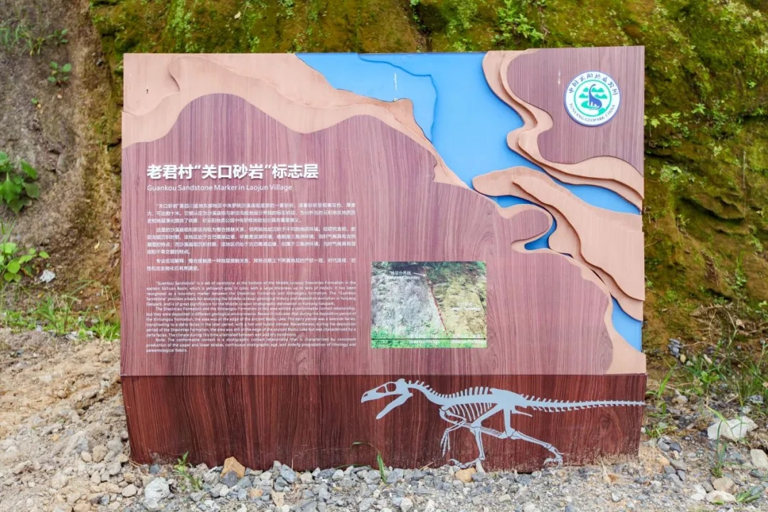 离开恐龙遗址馆,我们前往老君村的“关口砂岩”标志层。这里不仅是地质学家的天然教科书也是普通游客了解地球历史的绝佳地点,站在这里你可以清晰地看到地层的变化与沉积历史的痕迹。