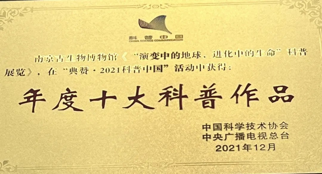 凭借着专业的科学内容、通俗易懂的表达、活泼新颖的展陈方式,南京古生物博物馆“演变中的地球、进化中的生命”主题展览,在全国“最具影响力的科普活动”——“典赞·科普中国”评选活动中,从五百多家参评单位中脱颖而出,荣获2021年度十大科普作品。