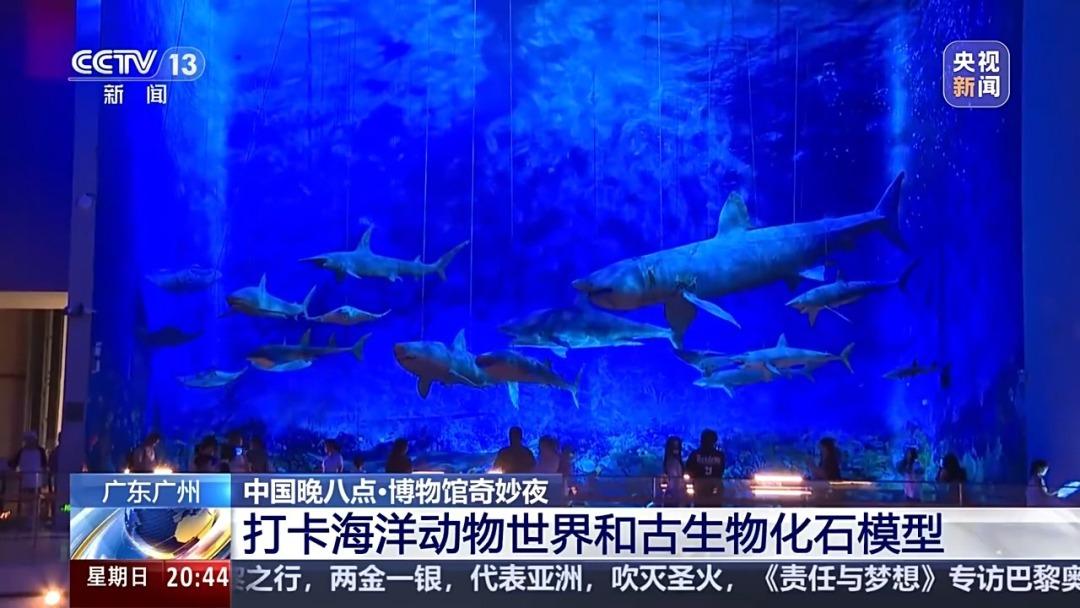 海洋馆是广东省博物馆一个非常著名的打卡点。深蓝色的氛围,仿佛置身于神秘的深海之中。其实,这是一些海洋生物的模型,非常逼真可爱,既有小巧的鱼群,也有巨大的蓝鲸。用钢丝悬空吊起,配上流光溢彩的氛围灯,营造 出深海之中波光粼粼的奇幻效果。
