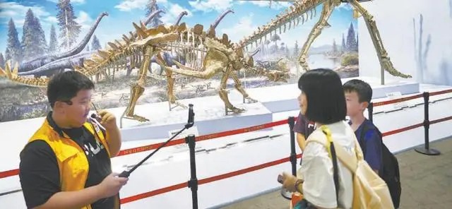 此次两家博物馆将剑龙始祖——太白华阳龙请进了展厅。展厅中,太白华阳龙的骨架和模型并排而立,带领观众穿越回侏罗纪。
