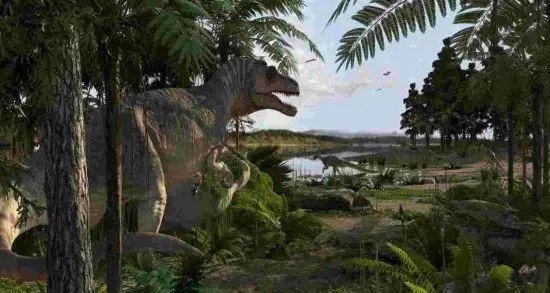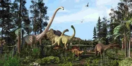 距今2.52~0.66亿年中生代自然地貌环境与现代截然不同,天时地利特别适应恐龙生存。地壳剧烈运动在地壳大陆形成诸多山间盆地,河流湖泊星罗棋布,得天独厚温床般空间环境为恐龙家族繁衍生息奠定坚实基础。全球气候环境温暖潮湿,极地和赤道温差较小,水杉、苏铁、松柏、银杏、悬铃木等喜温森林植物茂盛,古树参天,丛林密布,为食素恐龙提供源源不断的“粮食资源”。专家推测恐龙食物量相当大,一头30吨重蜥脚类素食恐龙,日进食2吨。中生代煤炭资源广泛分布,印证彼时高大乔木生长环境。上个世纪80年代加拿大地质学家在北极圈埃尔斯米尔岛发现一片以水杉为主树林以及鳄等化石,说明极地具热带气候环境。