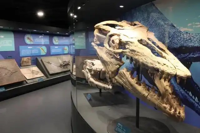 在“重返海洋”单元,讲述爬行动物重返海洋的演化奇迹,除了众多精美的标本模型,最值得关注的是一具沧龙头骨化石,沧龙在当时是体长可达15米的海洋凶残猎手。