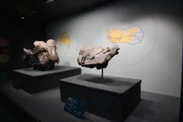 “哺乳初现”讲述的是哺乳动物的祖先类群以及爬行动物向哺乳动物演化的过渡类群,如二叠纪拥有双犬齿的食肉动物狼鳄兽,它的化石标本是首次展出。