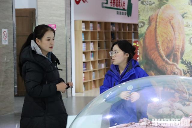 ↑ 资深讲解员赵敏余向记者讲述恐龙故事