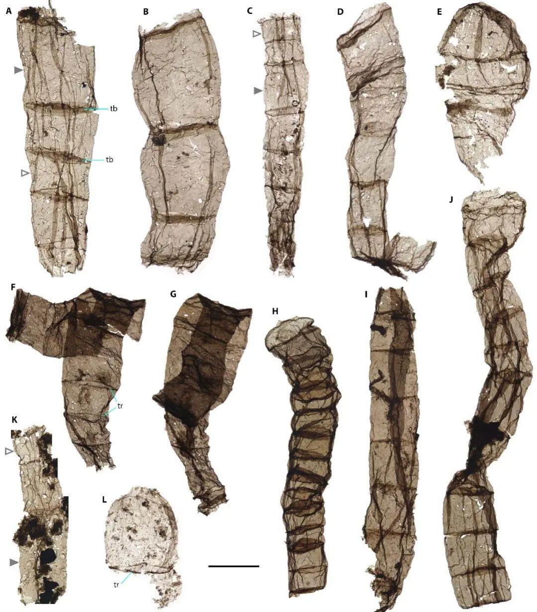 这些化石有些丝状体直径保持不变,细胞呈短柱状至长柱状;有些丝状体整体向一端均匀收缩,细胞呈柱状、桶状或杯状;而有的丝状体仅一端变细(图1)。通过测量显示不同类型的多细胞丝状体在形态上呈现连续过渡变化的特征,研究人员发现这些多细胞丝状体化石属于同一个物种。
