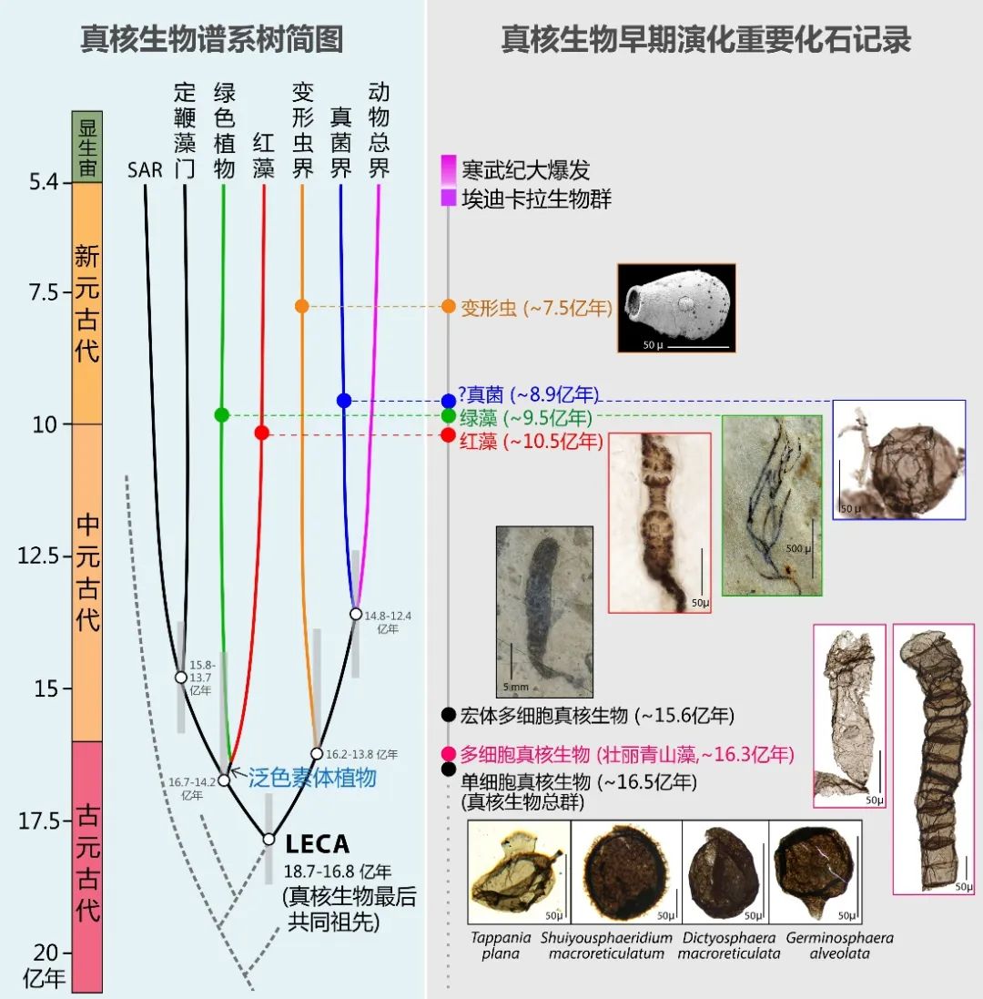 ↑ 真核生物谱系发生树简化图和真核生物早期重要化石记录.