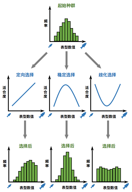 表型根据相关环境条件而受到几种不同的选择作用:发生线性的定向选择(directional selection)时,数值向一个方向变化对生物体生存和繁育后代是有益的,比如变大是有益的;而非线性的选择作用,包括数值“不大不小”最为有益的稳定选择(stablizing),以及数值变大和变小都更有益的歧化选择(disruptive selection)[1]。在生物种群繁衍一代的过程中,不同的选择作用导致种群中该表型的分布发生变化。
