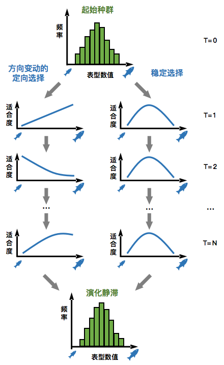 可想而知,定向选择可以使表型分布向某个方向偏移,逐代积累就会使整个物种的表型发生变化;而稳定选择则会使得物种的表型“原地不动”。因此,新达尔文主义认为,长时间持续的稳定选择可以解释我们在化石记录中观察到的演化静滞现象。