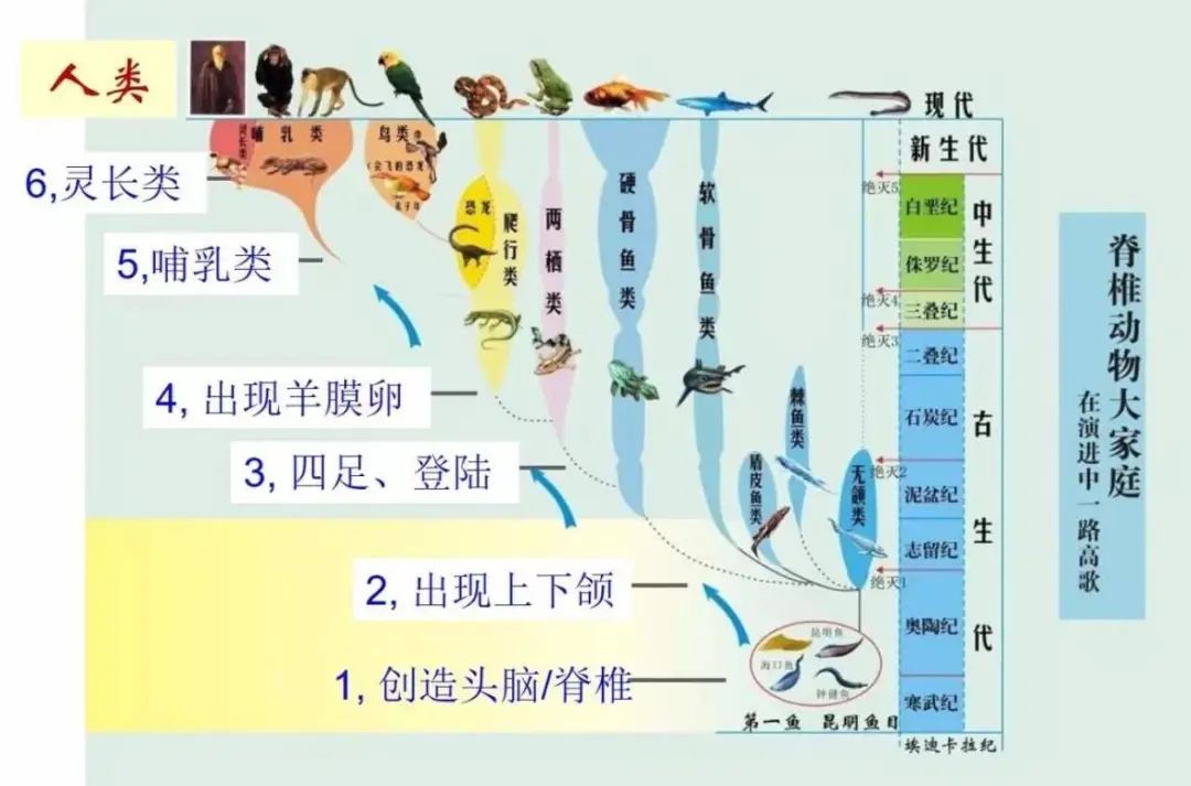 生物的演化过程并非简单的线性变化,也不是单一的螺旋线,其中既包括缓慢积累的过程,也有重大的突变。从寒武纪开始,生命形式逐渐变得复杂,留下了大量化石,证明生命演化的速率逐渐加快。寒武纪时期,澄江动物群中出现了最原始的脊索动物,尽管古生代主要以海洋无脊椎动物为主。