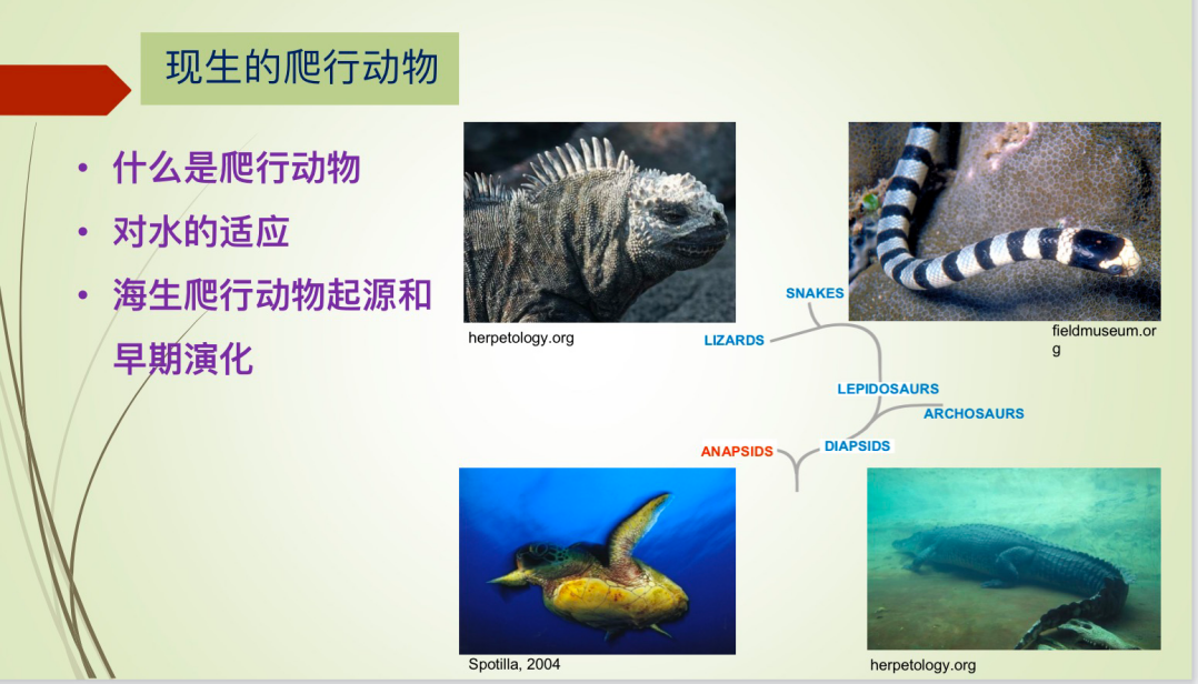 刚才我们提到了生物的演化,中生代是爬行动物的时代。与现代相比,如今的爬行动物已经在生物世界中退居次要地位,不再是主角。现代的爬行动物包括蛇、蜥蜴、龟、鳄鱼等,它们的分布范围和属种多样性相较于哺乳动物较为有限。