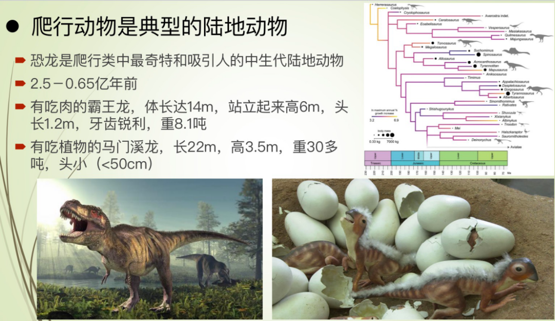 爬行动物是真正的陆地动物,即使一些鳄鱼和龟类可以在水中生活。在中生代,陆地上出现了巨大而凶猛的霸王龙以及马门溪龙等巨型恐龙,展示出生命的多样性。