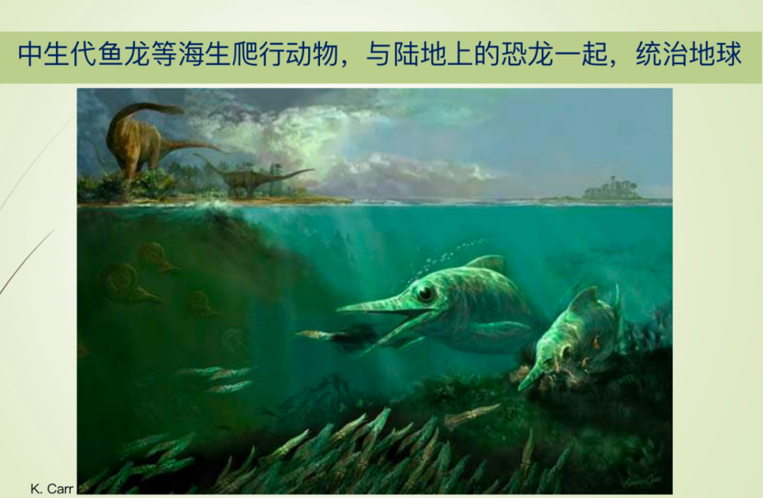在中生代,恐龙统治着陆地,各种海生爬行动物,如鱼龙和蛇颈龙占据大洋,而翼龙和鸟类统治着天空。与此同时,哺乳动物的祖先也在中生代起源。白垩纪末期发生了一次大灭绝事件,而在大灭绝事件后,哺乳动物在新生代迎来了发展的机遇,最终演化为现代人类。