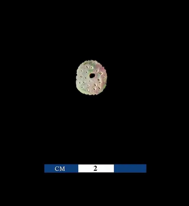 其中有一件近似圆形的饰品,样子十分精美。孙永春介绍,这件蚌饰品是用蚌壳制作而成,直径只有1厘米。它的周缘被切割成齿轮状,中央有一穿孔,四周点缀了19个未穿透的小碓窝,显示出了当时高超的工艺水平。