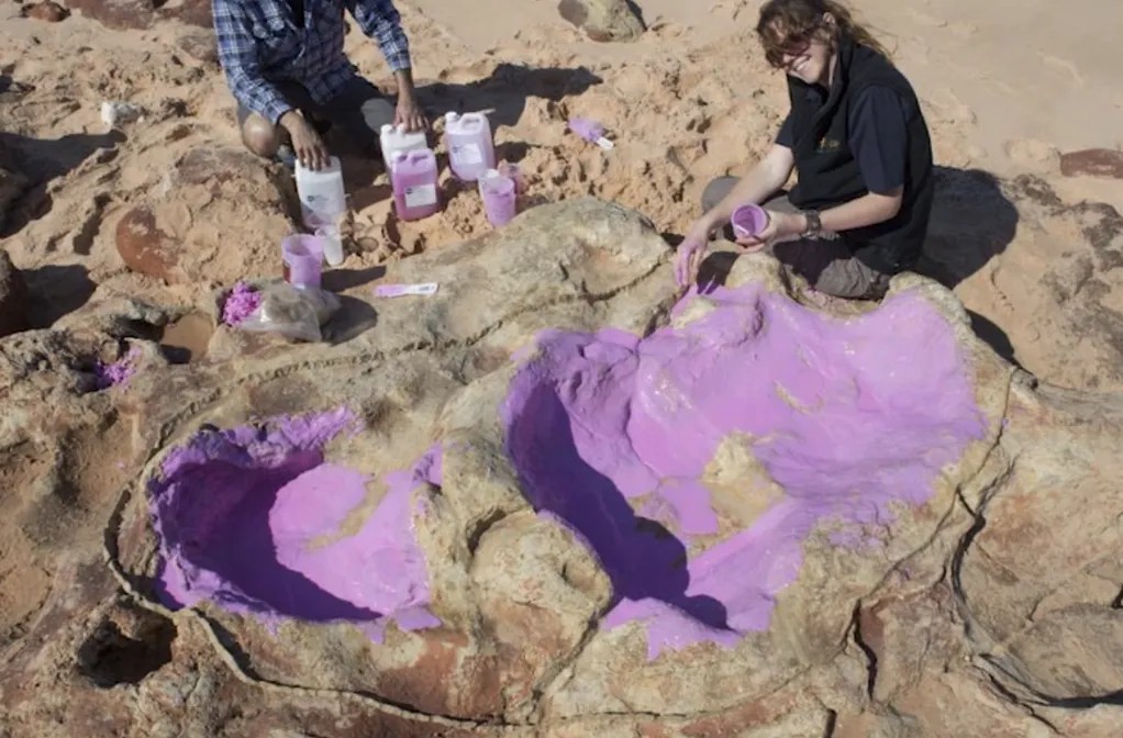 ↑ 一位科学家采集恐龙脚印的场景,她用一些橡皮泥把恐龙脚印围起来,再用硅橡胶涂满这个足迹,