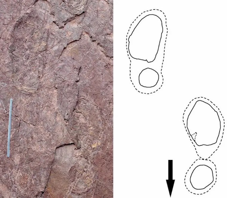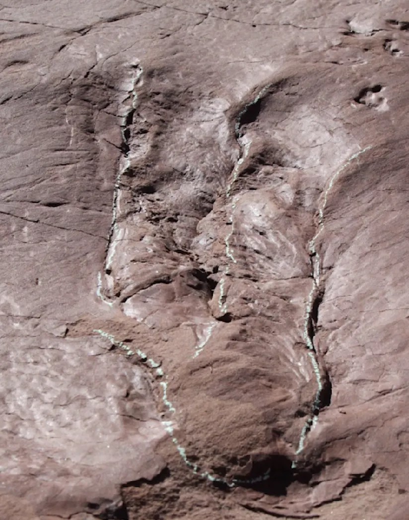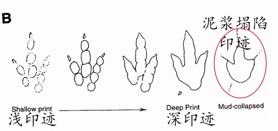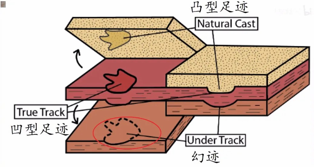 脚印与脚印之间也有不同,正常人类的脚印是凹陷的,恐龙也有凹形脚印,但当凹形脚印被填充,原本形成脚印的地层被侵蚀,便可以形成凸形脚印,它是突出于表面的,可以直观地反映出难以观察的拇指印和皮肤痕迹。除了常见的这两类恐龙脚印化石,如果地层很松软,恐龙走过还会在下层基质出现印痕,越往下的地层变形越小,除了直接接触的地层上形成的痕迹,其他的都叫作幻迹。幻迹带来的麻烦是确定不了哪一层是最初的脚印层,除非上面留下了某种关键性的证据比如恐龙脚上的鳞片或者褶皱印痕、碎石泥缝、波纹痕或雨滴的重叠等。