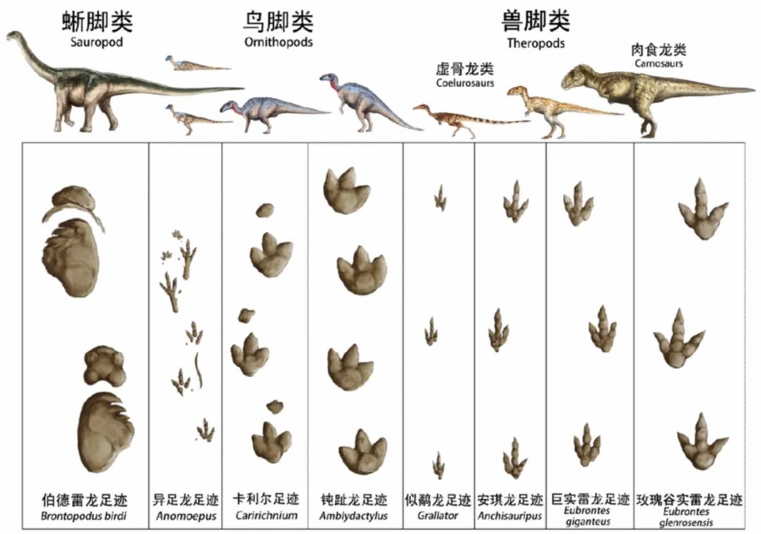 有了这些脚印,我们就可以大体辨认留下这些脚印的主人。科学家们一般通过骨盆的不同将恐龙分为蜥臀目和鸟臀目,但古生物学家难以根据足迹来判断恐龙的骨盆长什么样子,所以只能将它们分为遗迹科、属和种。