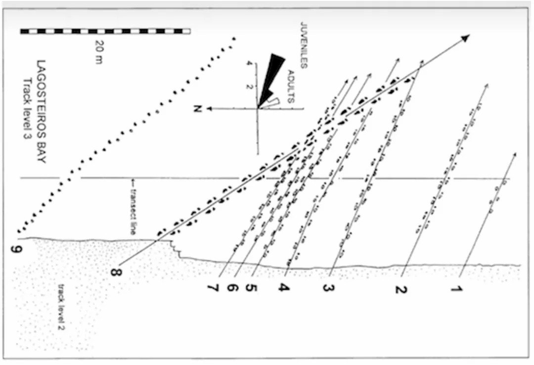 ↑ 九只恐龙在前后间距很短的时间通过这段地方留下了足迹,说明恐龙是一种群居性动物