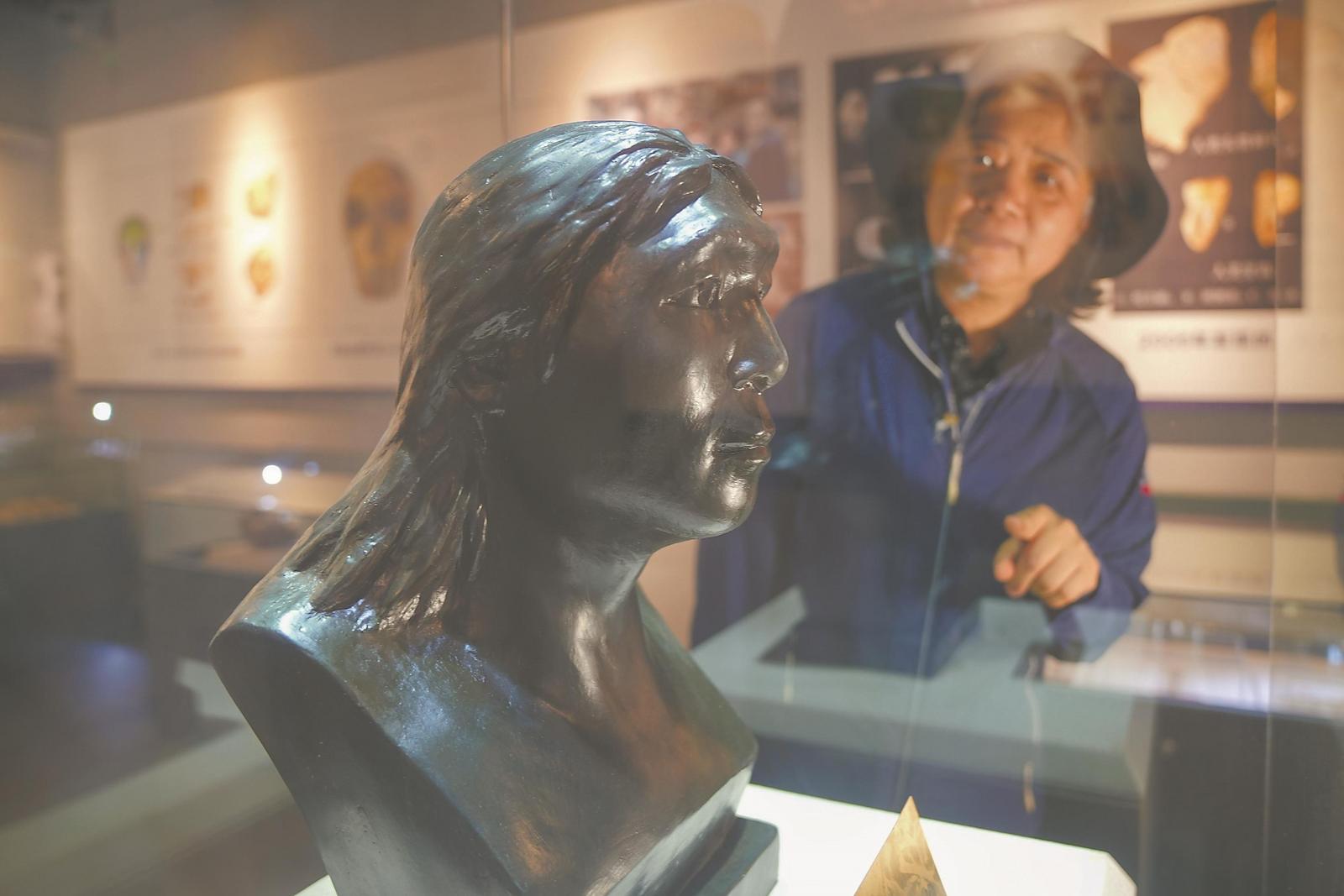 ↑ 根据古人类头骨化石复原的“东至姑娘”头像。记者 李博 摄