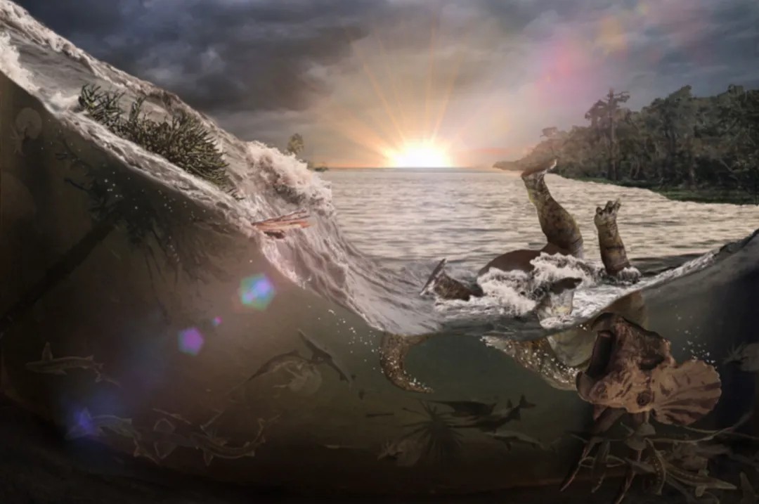 ↑ 图3. K-Pg界线撞击发生时塔尼斯的卡通场景(图自Robert DePalma)