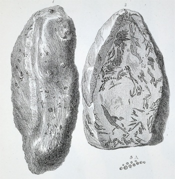 ↑ 最早研究的鱼龙粪化石,里面有未消化的鳞片、牙齿和骨骼