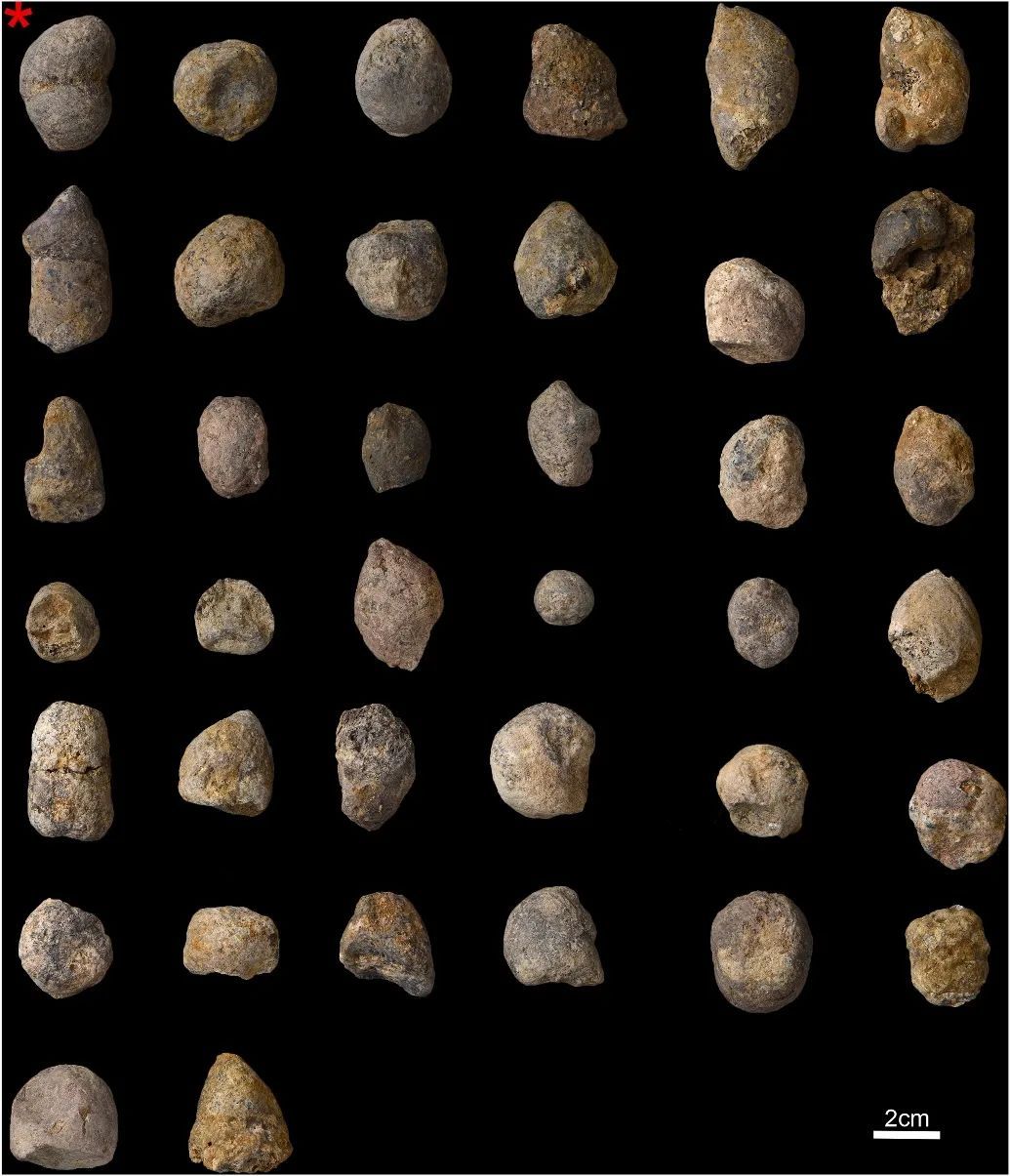 下图是研究人员找到的38件粪化石,像不像小时候用弹弓打的球儿?