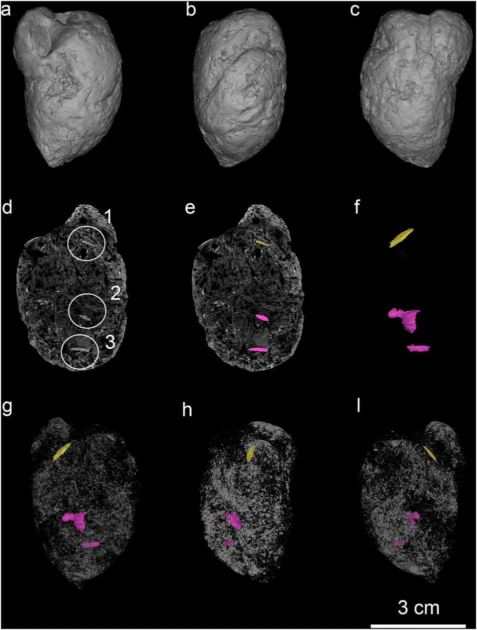 ↑ 显微ct扫描影像,紫色为小动物的肩胛骨,黄色为其他骨骼碎片(图片来源:保罗·拉米供图)