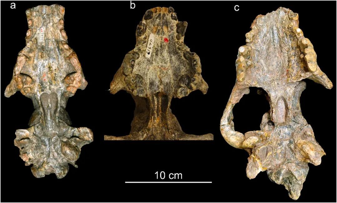 ↑ 食肉类哺乳动物头骨比较,左为元谋拟豺、中间为恐犬、右边为短吻鬣狗(图片来源:保罗·拉米供图)