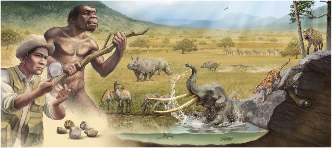 从一颗小小的粪便,窥视了复杂的生物链。研究人员在论文的最后重建了自己心目中百万年前的古环境:在一片干旱少雨的河谷地带,一片小池塘周围形成了草原,中国犀、云南马、鹿等植食动物一边觅食、一边警惕(不要变成食物),虎、鬣狗、豺等肉食动物则在不远处寻找时机,而古人类祖先手持简单的工具随时准备捕猎。科学家希望,通过揭示同一古生态环境下不同种类之间的相互关系,引发人们思考气候、植被、动物群及古人类之间的生存斗争。