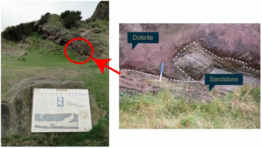 但是,赫顿需要更有力的证据:熔岩流侵入在水中形成的层状沉积岩的迹象。有次赫顿在爱丁堡南部山丘上漫步时,发现这座高耸于城市之上的山脉-亚瑟王座山,山脉北侧的索尔兹伯里峭壁则是古老火山岩凸出来的断崖。最终他在峭壁的西南坡上发现了他所寻找的东西:玄武质熔岩侵入沉积岩层,使沉积岩变形。这个地方现在非常有名,被称为“赫顿剖面”(Hutton's Section)。在很多地质学课程教授过程中,老师都会定期带学生来这里考察实习。