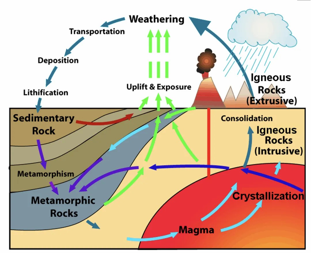 依据现代科学的研究,我们将地球上的岩石分为三个大类:火成岩(Igneous rocks)、沉积岩(Sedimentary rocks)、变质岩(Metamorphic rocks)。其中火成岩占了绝大部分,分布在从地面到深达16千米的地方,其是地幔中的岩浆涌入岩石圈或出露地表冷凝成固态形成的;沉积岩是在地表或近地表不太深的地方形成的一种岩石类型。它是由风化产物、火山物质、有机物质等碎屑物质在常温常压下经过搬运、沉积和石化作用,最后形成的岩石。不论哪种方式形成的碎屑物质都要经历搬运过程,然后在合适的环境中沉积下来,经过漫长的压实作用,石化成坚硬的沉积岩。变质岩是指在地壳形成和发展过程中,早先形成的岩石,包括沉积岩、岩浆岩,由于后来地质环境和物理化学条件的变化,在固态情况下发生了矿物组成调整、结构构造改变甚至化学成分的变化,而形成一种新的岩石,这种岩岩被称为变质岩。而三者之间也可以进行相互的转化和循环。