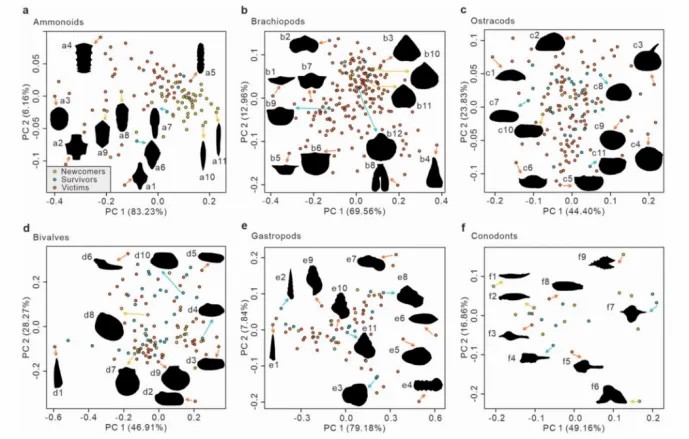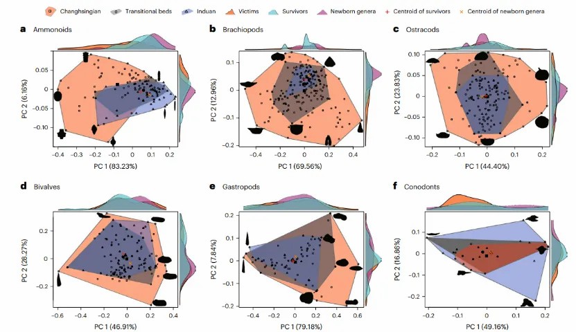 ↑ 二叠纪-三叠纪大灭绝期间六个分支的灭绝者、幸存者和新出现者的形态变化。黄色为新出现者,