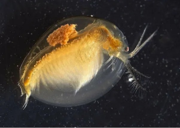 ↑ 现存的介形虫,就像一只包裹在两瓣甲壳中的虾,它们数量众多的甲壳是地层中的重要化石。(图片来源:Canada's Polar Life)