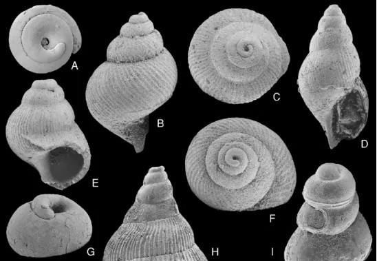↑ 古生代的腹足类(螺类)化石,与现在的螺类也很相似。(图片来源:参考文献2)