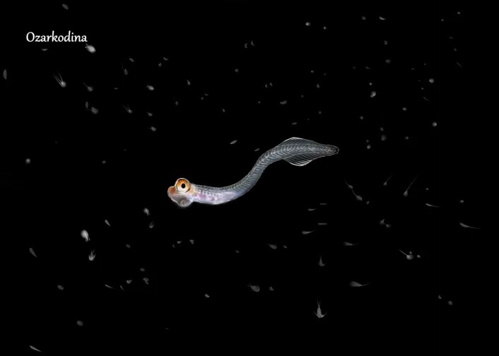 ↑ 牙形类奥泽克刺Ozarkodina的复原图,牙形类是一类无颌类脊椎动物,长的像一条小鱼,它们口部的牙齿一样的结构变成化石,