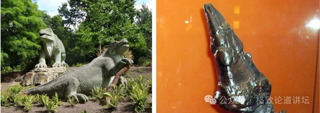 这是一种著名的恐龙叫做禽龙,是世界上最早被命名的恐龙之一。当时发现右边这个化石的时候,大家就看见了这个尖锐的、像锥子一样的结构。但由于发现的化石不完整,所以当时的科学家认为,这个像锥子一样的生物结构很可能像现在的牛角一样长在头上。如果今天你去英国伦敦看最早的禽龙的复原雕像,就会发现它被放在了脑袋上。