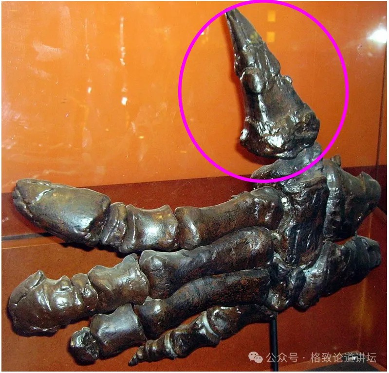 这是一个比较容易判断的案例。为什么容易呢?因为禽龙长了5根手指头,而我们熟悉的动物一般都长着5根手指头。不管是锥子状还是其他的奇形怪状,只要长在最里边,是5根当中的第一个,我们就把它叫大拇指。