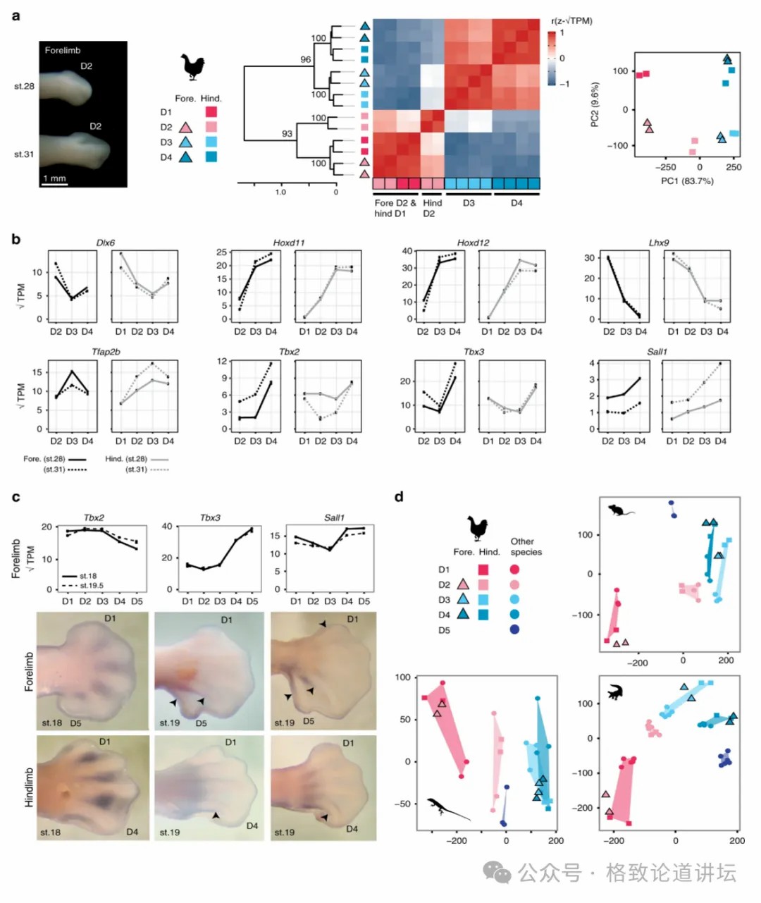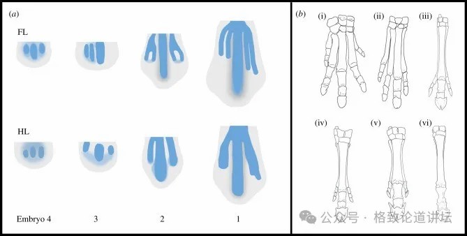 在我们的工作之后,很多的科学家也从其他角度来解决这个问题。比如前几年也有一组发育学家发现了一些新的东西。我们原来认为鸟类的手指是从中间3根手指发育出来的,但如果看它的转录组数据会发现,现在鸟类的3根手指相当于是Ⅰ、Ⅲ、Ⅳ,而不是刚才讲的由位置信息确定的Ⅱ、Ⅲ、Ⅳ,这些发现让这个问题更加复杂了。