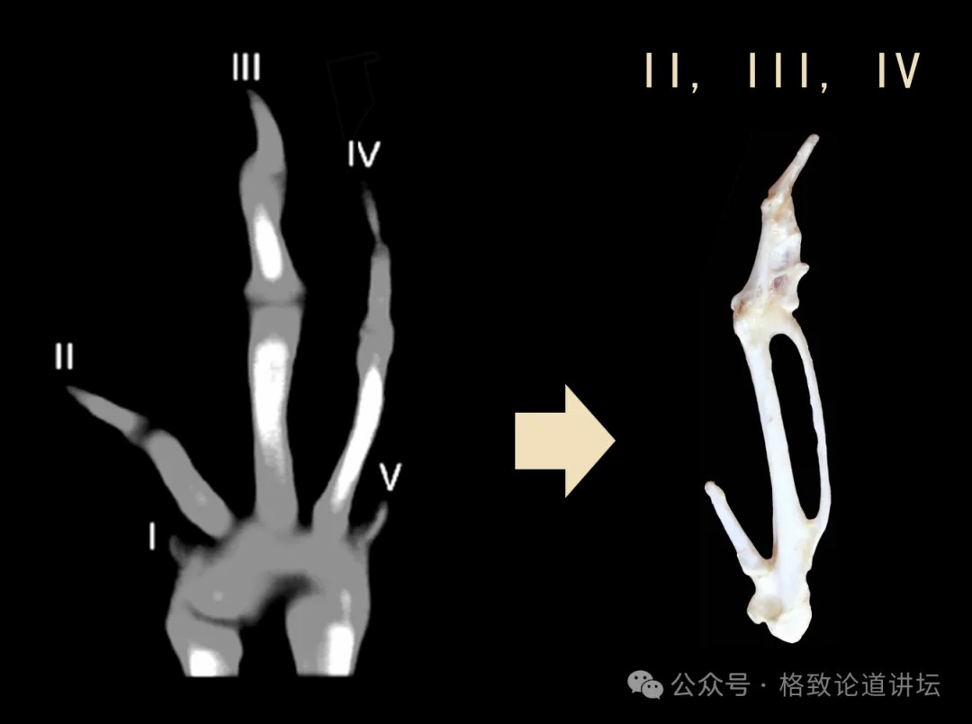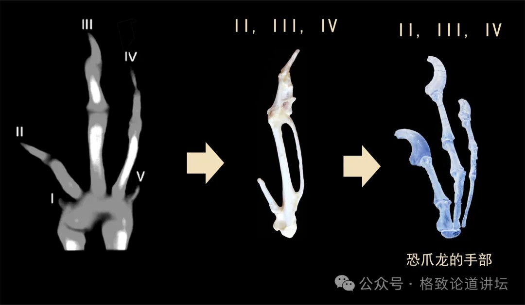 我们现在来做一个简单的逻辑推理。我们都知道,恐龙变成了鸟类已经是一个公认的科学理论了。通过胚胎发育,我们知道了鸟类高度变形的3根手指是Ⅱ、Ⅲ、Ⅳ,也就是食指、中指和无名指。