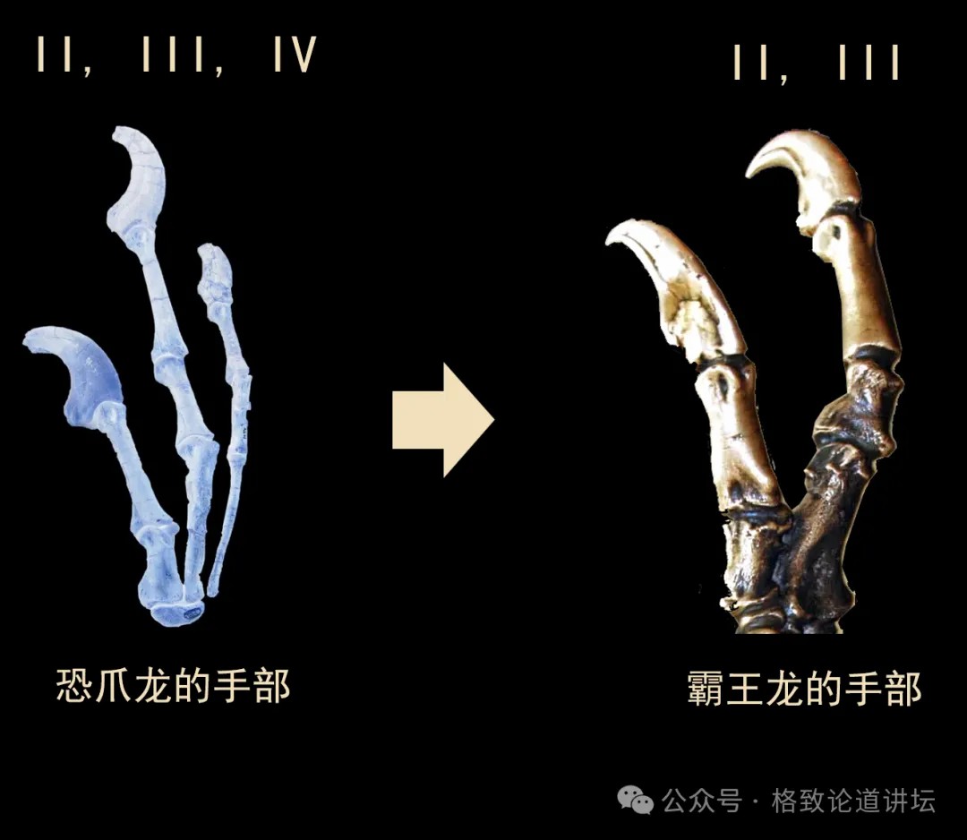 霸王龙也是三指恐龙这个大家族中的一个成员,但如果你仔细看霸王龙的手指头,可以看见它的形状和三指恐龙里边的2根手指头是对应的。所以我们就可以得出一个简单的推论:既然三指恐龙是Ⅱ、Ⅲ、Ⅳ这3根手指,那么霸王龙的两根手指一定就是Ⅱ和Ⅲ这两根,也就是食指和中指。